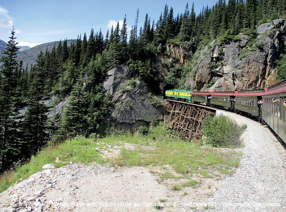 Construite à partir de 1898 à l’époque de la grande ruée vers l’or vers le Klondike qui ébranla cette région du nord du continent américain à cheval entre Canada et Alaska, la White Pass and Yukon Route relie le port de Skagway, dans l’État américain de l’Alaska, et Fraser dans le territoire canadien du Yukon. Cette ligne à voie étroite transportait les prospecteurs et leur matériel jusqu’aux mines d’or et, à son apogée, elle parcourait 180 kilomètres jusqu’à Whitehouse, au Canada. À l’époque, il est le premier train au monde à être équipé de conteneurs. Aujourd’hui, c’est un train touristique parmi les plus célèbres d’Amérique du Nord.