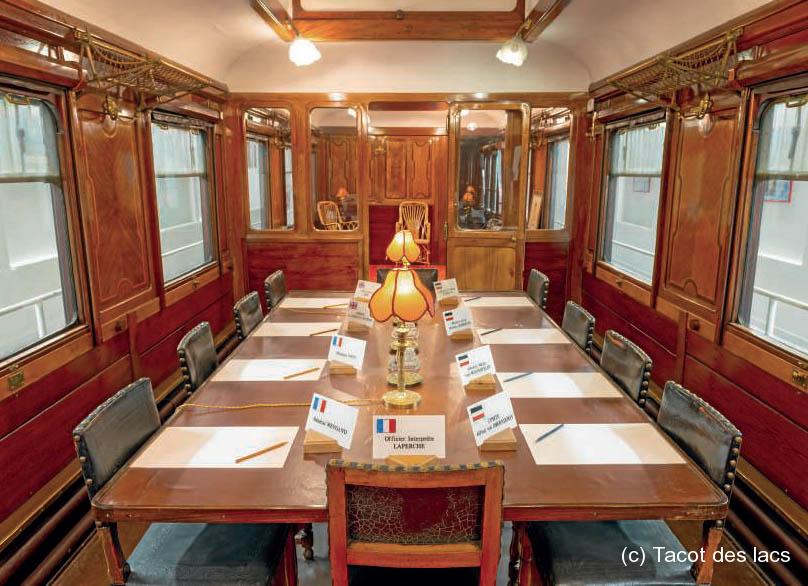 Dans la forêt de Compiègne (Oise), la clairière de Rethondes fut il y a cent ans le théâtre d’un événement historique. En effet, c’est là que, le 11 novembre 1918 à 5 h 15, la convention d’armistice fut signée entre les Alliés, représentés par la France et la Grande-Bretagne, et les plénipotentiaires allemands, à bord du wagon 2419D stationné, qui avait été spécialement aménagé pour l’occasion. L’armée française avait réquisitionné le wagon auprès de la Compagnie internationale des Wagons-lits (CIWL). Ce dernier a été emporté à Berlin en juin 1940 sur ordre d’Hitler, puis détruit – mais le mémorial, qui est situé dans la clairière de Rethondes, expose un wagon de la même série (photos ci-dessus), le 2439D. Long de 20 mètres, il est aménagé à l’identique et décoré avec le mobilier d’origine.