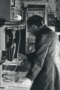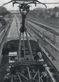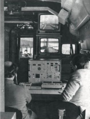 À l’extrémité côté R2 de la remorque laboratoire, dans l’angle droit, les techniciens chargés de l’observation permanente du pantographe. Trois moniteurs (écrans de télévision) dont un de contrôle de l’image enregistrée sur magnétoscope afin de visionner à nouveau un incident éventuel, permettent une surveillance du comportement du pantographe à tout instant.