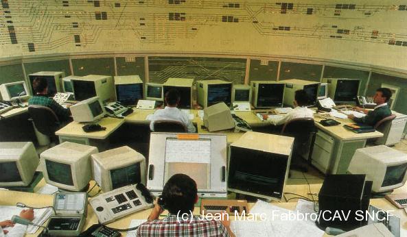 Par exemple, le suivi des trains. Le tableau de contrôle optique (TCO) comportait des fenêtres où apparaissaient, à tour de rôle, les numéros (index) des circulations. L’ordinateur prenait également en charge la succession des trains et la commande automatique des itinéraires correspondants. Parallèlement à ce développement des postes d’aiguillage, on s’orientait vers la réalisation de commandes centralisées de plus en plus longues. Après quelques expériences isolées (Houilles – Sartrouville, dès 1933), Dole – Vallorbe montrait la voie au début des années soixante. Mais sur la ligne nouvelle Paris-Sud-Est, vingt ans après, le poste d’aiguillage et de régulation régnerait sur 390 km de ligne, là aussi grâce au suivi des trains. Apparue à Versailles, développée à Juvisy et La Part- Dieu, la technique informatique, sous l’espèce de fichiers de trains mémorisés ou de programmateurs d’itinéraires, avait essentiellement pour rôle d’alléger le travail de l’aiguilleur, en lui permettant de programmer des passages de trains en succession sur différents itinéraires. Elle ne se substituait pas franchement à la commande individuelle des itinéraires, aux boutons et commutateurs de PRS.
