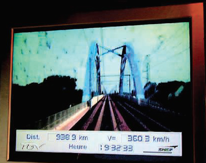 Que dire, ensuite, du trajet lui-même ? Jusqu’à la LN5, pas grand-chose : la gare de Lille-Europe traversée à 200 km/h, un drôle de soubresaut dans la Somme (dû un affaissement de terrain ?), et une LGV Sud-Est à 330 km/h en plaine… En fait, une impressionnante régularité (voir graphique dans le caroussel de photos ci-dessus), grâce à une exceptionnelle maîtrise du captage électrique par les conducteurs. Dans la rame, le spectacle était sur les écrans. Dans chaque voiture, des écrans renvoyaient des images de l’exploit qui s’annonçait (voir petit texte ci-dessous). Les voyageurs étaient spectateurs de leur propre « aventure », les yeux rivés sur les images et les indicateurs du parcours, à tel point que lorsqu’un clip à la gloire de la LN5 interrompit l’affichage du nombre de kilomètres et de la vitesse instantanée, la bronca menaça…
