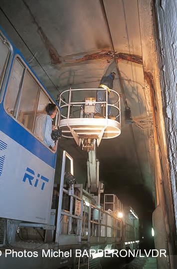 Une fissure dans un rail, on sait à quoi s’en tenir. Une fissure dans un tunnel, c’est un problème d’interprétation qui fait appel à l’expérience », résume un expert régional ouvrages d’art. Le métier de ces hommes qui travaillent essentiellement la nuit, lorsque les trains ne circulent plus, est capital : la sécurité des circulations et des voyageurs en dépend. Selon une consigne générale SNCF (CG EF 9D n° 4), chaque tunnel exploité doit faire l’objet d’une visite annuelle et d’une inspection détaillée tous les cinq ans. Cette dernière est également obligatoire un an après la mise en service des tunnels neufs, notamment ceux des lignes nouvelles. La surveillance et les petites interventions sont effectuées à l’aide de 11 wagons d’inspection des tunnels (WIT) mis au point après le très grave accident de Vierzy en 1972, au cours duquel un effondrement s’était produit dans un tunnel en travaux. A cette époque, les contrôleurs d’ouvrages d’art ne disposaient en effet pas de moyens modernes de vérification. Rattachés aux unités opérationnelles logistiques (UOL) de certaines régions SNCF, les WIT se déplacent sur l’ensemble du réseau. Ils sont constitués d’un toit aménagé en plate-forme qui permet d’inspecter la voûte de près et un bras élévateur supportant une nacelle depuis laquelle les points particuliers et les têtes de tunnels peuvent être observés. Plusieurs d’entre eux ont un wagon épurateur qui filtre les gaz d’échappement des locotracteurs et du groupe électrogène. Le WIT de l’UOL de Clermont- Ferrand est, par contre, équipé d’un wagon plat surmonté d’un ventilateur à grand débit destiné à chasser les gaz.