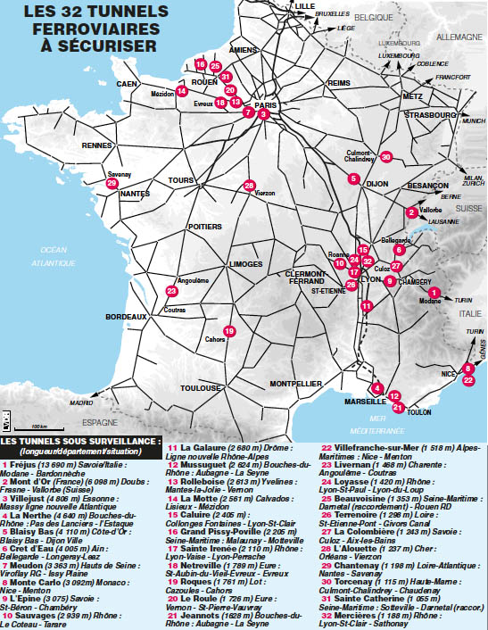 Dans la plupart des cas, cependant, des mesures spécifiques, a priori simples et peu onéreuses, seraient de nature à améliorer le niveau de sécurité. Il suffirait de tirer profit, par exemple, de l’existence de cheminées d’aération datant de l’époque de la vapeur et obturées ou comblées depuis, de la présence de la plate-forme d’une deuxième voie déposée à côté de la voie en exploitation, ou encore de la présence d’eau à proximité des têtes de tunnel. En fait, seuls 5 des 31 ouvrages exigent une attention particulière : le tunnel du Crêt d’Eau, le Fréjus, le tunnel franco-suisse du Mont-d’Or, le tunnel de Meudon et le tunnel de Blaisy-Bas.