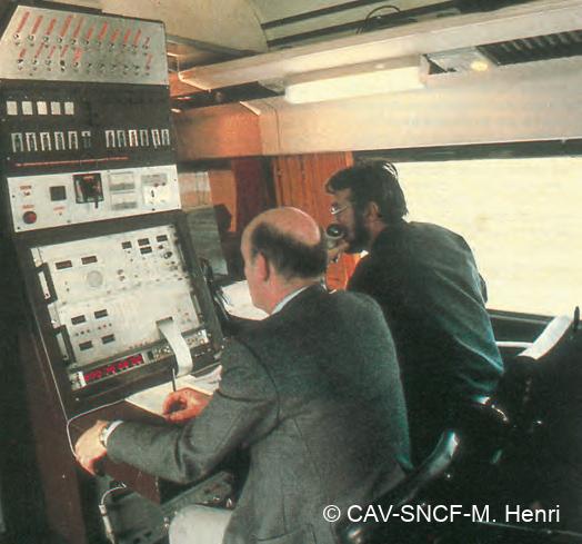 Lors de chaque marche d’essai nous transmettions par radio, environ deux minutes après le passage du TGV, les valeurs des soulèvements au support à M. Metzler qui se trouvait à bord de la rame. Sur celle-ci deux agents, l’un « pantographe », l’autre « caténaire » connaissaient, grâce à un dispositif de mesure, les débattements du pantographe dont ils surveillaient le comportement par télévision et ils pouvaient, à tout instant, commander la baisse d’urgence de celui-ci.