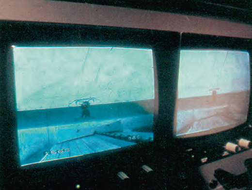 Surveillance de la tenue du pantographe au cours de l’essai, à l’aide de deux écrans reliés à des caméras placées sur le toit de la rame. Sur la vue de détail, on remarque au bas de l’écran les indications kilométrique (156,8) et de vitesse (366). © CAV-SNCF – P. Olivain
