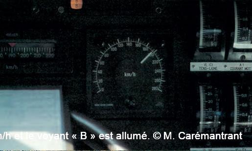 En cabine d’un TGV sur une section autorisée à 200 km/h. : le compteur indique 190 km/h et le voyant « B » est allumé. © M. Carémantrant