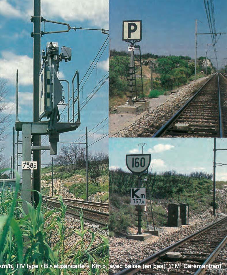 Pour les limitations de vitesse annoncées par des tableaux indicateurs de vitesse (TIV), et non à partir des indications lumineuses, un signal spécifique est mis en place de façon à permettre au mécanicien de ramener sa vitesse à 160 km/h. li s’agit d’un tableau de forme carrée, présentant en noir sur fond blanc la lettre « P », initiale du mot préannonce. Suivant qu’il s’agit d’une limitation fixe, pour une courbe par exemple (voir figure 3), ou d’une limitation pour l’emprunt d’une voie déviée de bifurcation, ce tableau est fixe ou mobile. Dans le deuxième cas, il est donc soit présenté pour l’emprunt de la voie déviée, soit effacé. En position d’ouverture, il présente une bande blanche verticale discontinue (voir figure 4)!; la manoeuvre est réalisée par un moteur électrique fixé sur le mât.