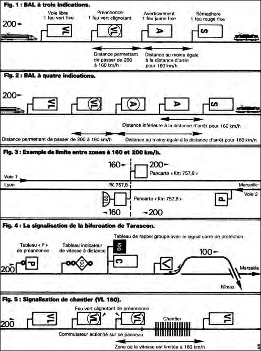 Tous les panneaux de signalisation des zones autorisées à 200 km/h ont été équipés de la préannonce. Rappelons que ce système a été étudié afin d’utiliser au mieux les installations existantes, c’est-à-dire le block automatique lumineux (BAL). Au lieu de créer une signalisation spécifique complète, on a simplement ajouté une indication supplémentaire appelée « préannonce ». Présentée sous la forme d’un feu vert clignotant, elle commande au mécanicien d’un train autorisé à plus de 160 km/h de ramener sa vitesse à 160 km/h au maximum, lors du franchissement du signal fermé suivant!: les signaux ainsi préannoncés sont des signaux à distance tels que l’avertissement, le feu jaune clignotant et les ralentissements à 30 ou à 60 km/h. Dans ces conditions, le mécanicien retrouve les indications habituelles d’annonce d’arrêt ou de ralentissement auxquelles il peut réagir comme s’il s’agissait d’un train classique. Cette conception présente l’avantage suivant: on utilise les signaux existants implantés, en règle générale, pour 160 km/h. Les figures 1 et 2 reprennent la signalisation rencontrée par un mécanicien dans le cas de l’espacement des circulations.