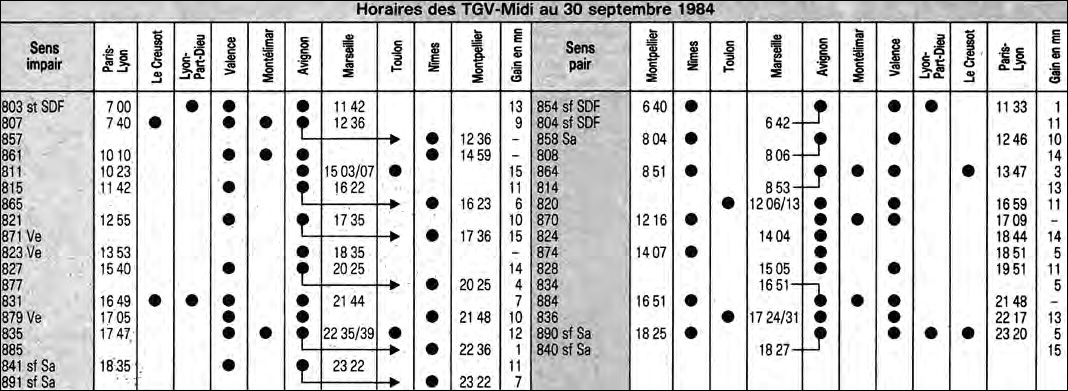 L’accélération qui en découle donne, par rap port aux horaires de l’hiver 1983/1984, des gains de temps de sept à dix-huit minutes sur les relations Paris – Marseille, et une à huit minutes sur Montpellier. De même, le trajet Valence- Avignon (124,4 km) sera couvert en cinquante et une minutes, à 146,3 km/h de moyenne, et Avignon – Marseille (120,8 km) en cinquante minutes à 145 km/h. Elle sera, accompagnée d’un remodelage de la desserte tenant compte des observations faites au sujet de la physionomie des déplacements de la clientèle.