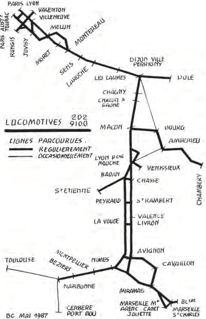 Alors que, dans les années 1950/1960, des pointes de 30 000/35 000 kilomètres par mois n!étaient pas rares pour ces machines, l’utilisation de la série s’abaisse d’année en année, comme le montre le tableau ci- après, relatif aux exercices 1980 à 1986. Le meilleur résultat est celui de la 9134 qui, en 1981, parcourt 241 202 kilomètres, alors qu’en 1985/1986, les parcours annuels varient entre seulement a 130 000 et 1 50 000 kilomètres. Malgré leur rôle secondaire, les 2D2 9100 n’ont pas moins eu l’occasion, ces dernières années, de fréquenter des artères nouvellement électrifiées Lyon-Guillotière – Vénissieux, la rive droite du Rhône, de Badan à Nîmes, ainsi que les raccordements de Peyraud, La Voulte, Villeneuve-lès- Avignon, la section Avignon – Salon – Miramas et même des incursions sur la Côte vermeille, de Narbonne à Port-Bou où elles étaient cependant limitées en vitesse. Par contre, elles n’ont jamais été engagées sur les lignes du golfe du Fos.