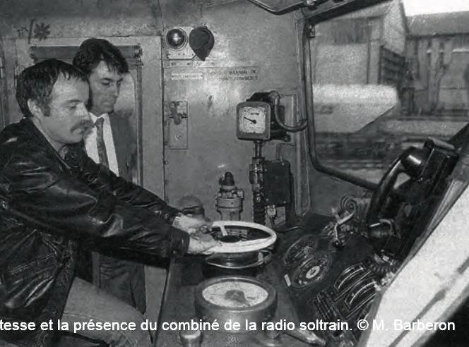 Régis Martel aux commandes de la dernière « batteuse ». A ses côtés, Gérard France, inspecteur traction. On notera la petite taille de l’indicateur de vitesse et la présence du combiné de la radio soltrain. © M. Barberon