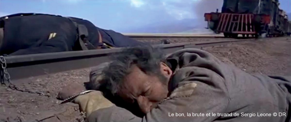 Pendant la guerre civile américaine, Tuco (Elie Valach) est entravé dans un train par une paire de menottes, accrochée à l’horrible caporal nordiste qui lui sert d’escorte. Le « truand » avait pourtant bien prévenu le militaire : « Les gros comme toi, ça m’a toujours fait rigoler, parce que quand ça dégringole, ça fait un de ces boucans ! ». Et effectivement quand il parvient à l’entrainer dans sa chute hors du train en marche, l’imposant soldat fait un beau boucan ! Seul dans le désert après l’avoir tué, Tuco trouve dans les rails l’occasion de récupérer l’usage de ses mains et sa liberté. Il place le cadavre sur les traverses et la chaine des menottes sur le rail en attendant qu’un train arrive pour la scier. Un succès pour le fugitif qui parvient même à monter à bord du train. Pour cette scène, l’acteur américain n’a pas été doublé. Personne n’avait remarqué que des marches en métal de trente centimètres dépassaient au bas de chaque voiture. Si Elie Valach avait relevé la tête un peu trop tôt, il aurait probablement été décapité ! Quand Leone lui a demandé de refaire une prise de la scène, l’acteur a refusé net. On peut le comprendre.