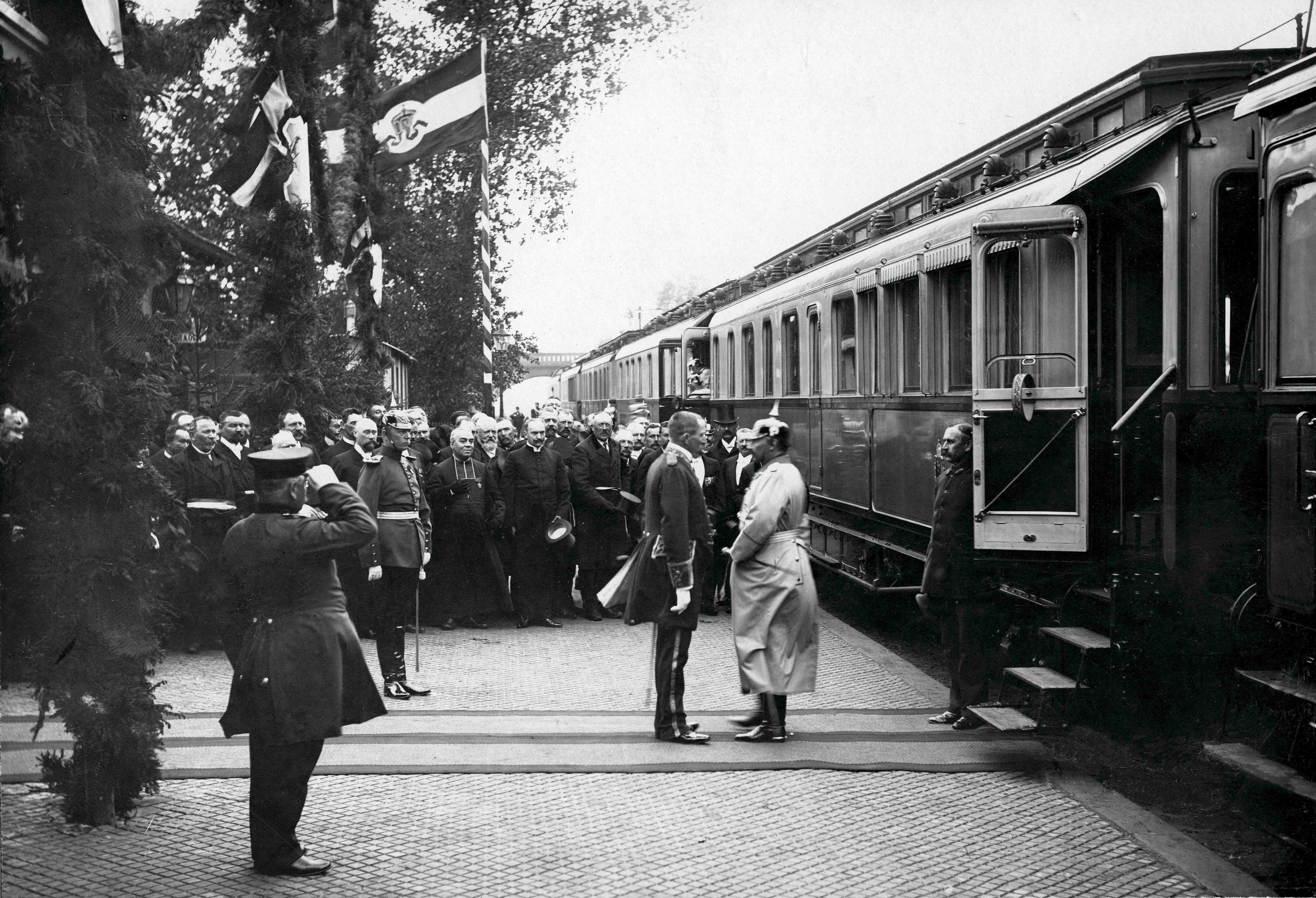 en grès cérame. L’empereur descend les marches et est accueilli par les notables locaux regroupés sur le quai décoré de branches de sapin et de drapeaux. On y distingue des personnalités politiques, des industriels, mais également des responsables des cultes catholique et protestant. Le personnage au premier plan à gauche est très probablement le chef de gare (Coll. J.-G. Trouillet).